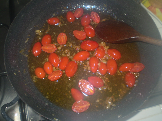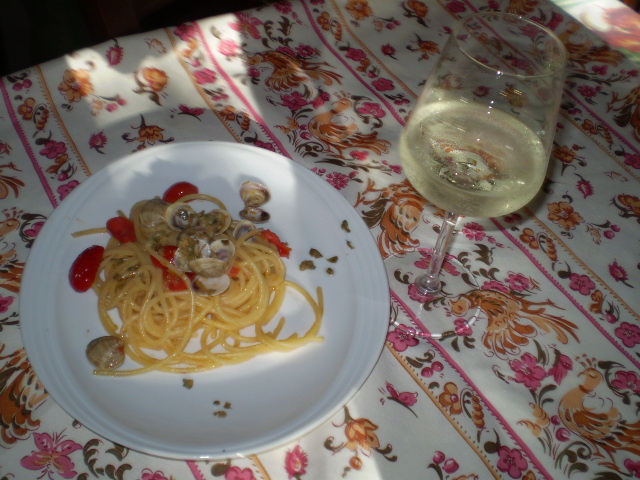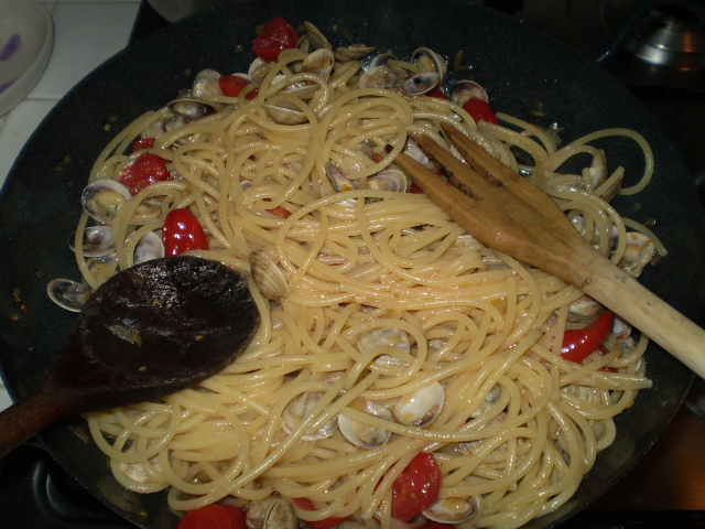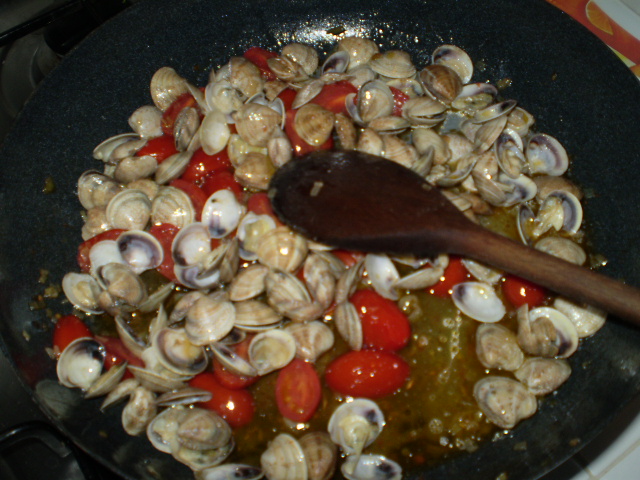 Mettere a spurgare le vongole in acqua e sale almeno 1 ora prima di usarle.In un tegame largo far soffriggere 1 scalogno tritato in abbondante olio.Unire i datterini lavati , asciugati e tagliati a metà nel verso della lunghezza.Far rosolare velocemente e spengere il fornello.In una pentola a bordi alti far aprire le vongole spurgate in un soffritto di olio e l'altro scalogno tritato .Unire il vino e incoperchiare.Spengere la fiammma quando le vongole saranno tutte aperte.Far riprendere calore al sugo di datterini e unire le vongole con poco liquido filtrato.Cuocere al dente gli spaghetti e far saltare la pasta nel sugo e unire ancora poco liquido delle vongole.In ultimo spolverare con i capperi tritati e servire.