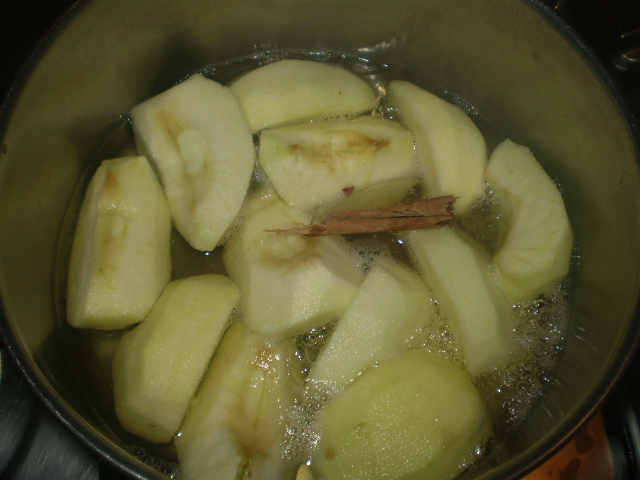 Mettere gli spicchi di mela in un tegame e unire i due alcolici (vino e cognac ), aggiumgere la stecca di cannella, portare dolcemente al bollore e proseguire la cottura fino a quando le mele avranno assorbito tutto il liquido. Scolare in uno scolapasta la frutta e lasciar raffrddare. Nel frattempo montare le uova con lo zucchero, unire le mele ben schiacciate e, a parte, caramellare in un pentolino i 100gr di zucchero. Ricoprire con il caramello il fondo di uno stampo rettangolare, inserire il composto e cuocere a bagno maria in forno già caldo per un'ora e mezza a 180°. Sfornare e lasciar intiepidire il dolce, quindi sformare e refrigerare per almeno 2 ore in frigo. Servire con fettine di mela fresca.