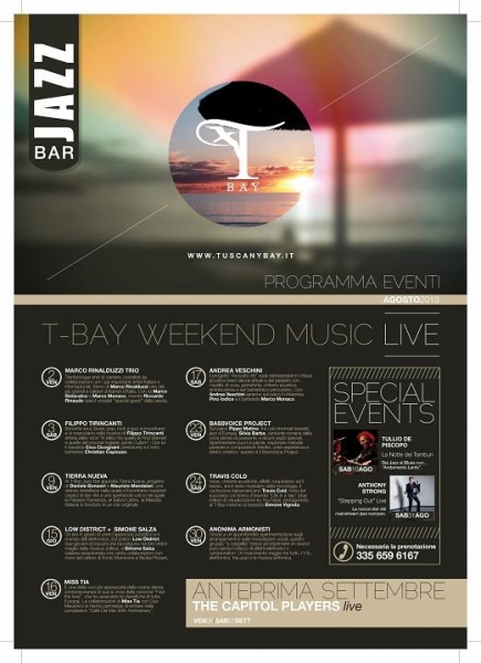 Vale la pena segnalare che tutti i weekend all'ora del tramonto il T-Bay Jazz Bar regalerà anteprime live dei concerti in programma, oltre a dj set lounge-jazz che accompagneranno il frizzante momento dell'aperitivo, da gustare in una cornice naturale di indubbio fascino. I live inizieranno invece alle ore 23 e sono per la maggior parte ad ingresso libero.