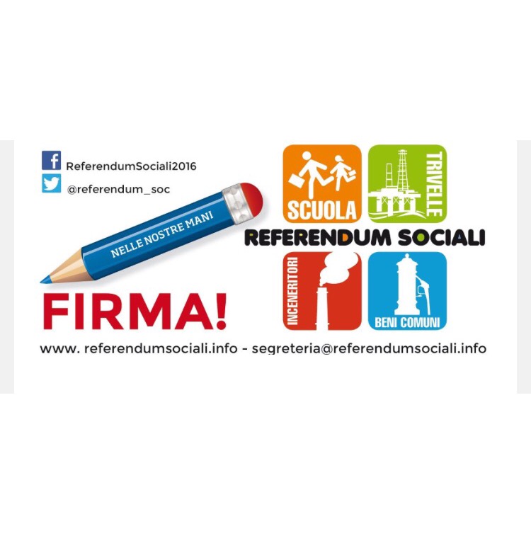 Intanto è iniziata la campagna dei Referendum sociali, per eliminare i punti più intollerabili della legge 107, gli inceneritori e le trivelle petrolifere, nonché per una Petizione popolare in difesa dell’acqua pubblica. Le giornate di preparazione e di effettuazione dello sciopero dovranno anche dare un grande impulso alla raccolta firme dei Referendum, strumento rilevante per battere la cattiva scuola di Renzi e per smantellare installazioni inquinanti e pericolose.