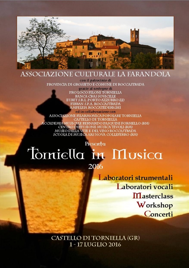 al nastro di partenza la IV edizione del Campus Torniella in musica, ideato dall’Associazione Culturale La Farandola con il Patrocinio della provincia di Grosseto e del Comune di Roccastrada, che si svolgerà a Torniella dal primo al 17 luglio 2016