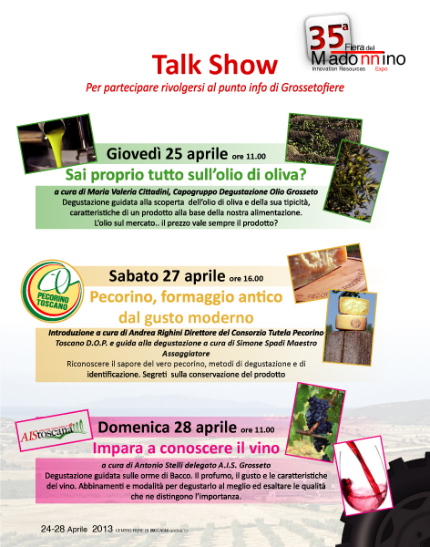 Grosseto: il 25,26 e 27 prossimi, la Fiera di Grosseto ha organizzato importanti momenti di incontro e discussione, appunto Talk Show, dove con l'aiuto di esperti dei vari prodotti sarà possibile percorrere un vero "viaggio" all'insegna della conoscenza dei prodotti del nostro territorio. L'importanza di questi eventi nell'evento fiera, è dato non dalla presentazione di prodotti come tali, ma dalla conoscenza delle dinamiche, caratteristi e peculiarità dei prodotti della Maremma, come vengono prodotti, conservati e degustati al meglio.