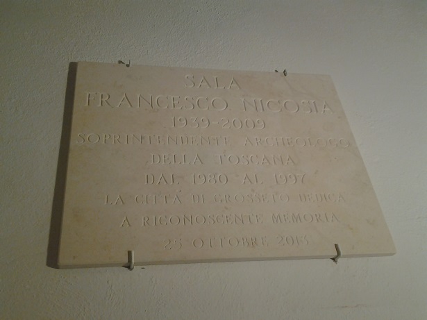 Francesco Nicosia, scomparso nel 2009, fu Soprintendente ai Beni Archeologici della Toscana (dal 1980 al 1997) e da sempre impegnato, anche prima di venire in Toscana, sul sito archeologico di Roselle dove vennero realizzati importanti interventi, intensificando le attività di ricerca e di restauro nell'area urbana (cinta muraria, edifici pubblici nel foro, aree insediative delle colline nord e sud, strade e botteghe), richiedendo la collaborazione di diversi archeologi della Soprintendenza e dell'Università di Firenze. Fondamentale anche il contributo dato da Nicosia al riallestimento dello stesso Museo Archeologico, assicurando alla città il deposito di innumerevoli e importanti reperti fino ad allora non visibili e favorendo anche la collaborazione tra i migliori restauratori del Centro di restauro di Firenze e quelli grossetani per razionalizzare e valorizzare al meglio l'esposizione all'interno proprio della Sala delle Statue.