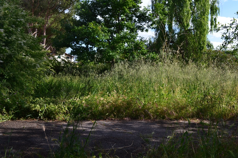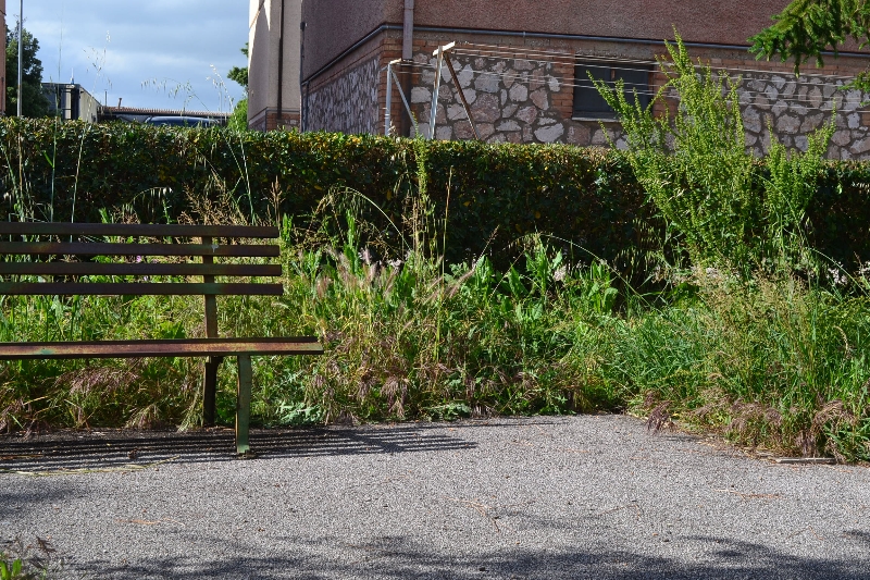 Le foto che seguono dimostrano lo stato delle cose: siepi invadenti, marciapiedi impraticabili, giardini con erba alta oltre un metro trasformati in una giungla, aiuole dove l’erba è stata tagliata solo per metà (forse era finita la miscela nel decespugliatore?), oltre naturalmente ad immondizia varia e in bella mostra una poltrona che sembra messa apposta per fermarsi ad ammirare l’ormai famoso “monumento del mazzo” che si presenta ancora senza copertura delle apparecchiature meccaniche ed elettriche.