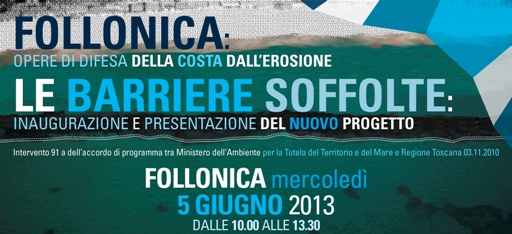 Follonica: oggi mercoledi 5 giugno a Follonica la Provincia di Grosseto e il Comune organizzano una mattinata dedicata all’erosione costiera. Nel particolare, il programma prevede alle 10:00, al Club Nautico, l’inaugurazione  delle opere concluse, oltre 1 km e 300m di barriere soffolte, e a seguire, nella sala Tirreno, si svolgerà un convegno per presentare il nuovo progetto in programma e per discutere delle azioni necessarie per difendere la costa.