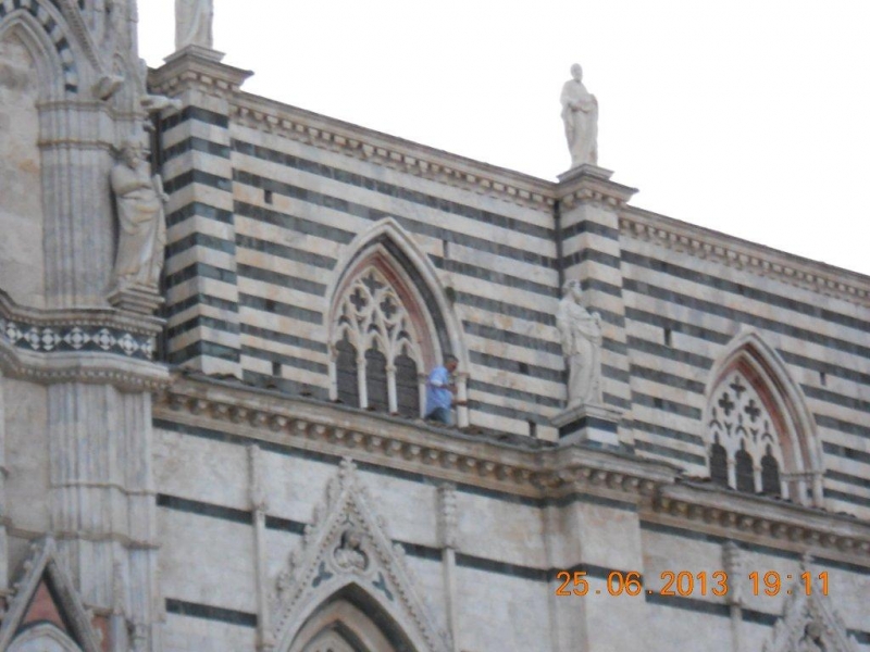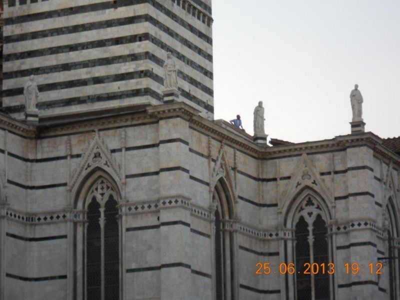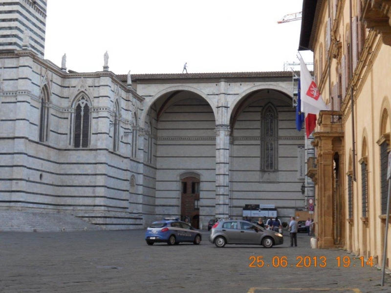 Grosseto: Sicuramente l'aver partecipato ad un'importante incontro in Prefettura sulle terme di Petriolo organizzato della locale sezione Unesco di Siena è stata un esperienza alquanto coinvolgente per il Presidente dell'Associazione Tuscany Wild Tuscani Roberto Boscarolo , il Vicepresidente dell'associazione Amici dei Bagni di Petriolo Vittorio Cambria ed il Tesoriere Carlo Giannarelli , ma quando sono usciti e si sono messi a discutere sull'esito del convegno svoltosi in Piazza Duomo ,intorno alle 20 di ieri, non hanno creduto ai loro occhi nel vedere che tra le statue che adornano il tetto del Duomo di Siena ve ne era una che camminava lungo il cornicione. Dopo essersi stropicciati gli occhi si sono resi conto che ne di statua ne di fantasma si trattasse , bensì di un aspirante equilibrista che con passo non sicurissimo si muoveva in un area interdetta al pubblico e molto pericolosa se percorsa senza le attrezzature previste dalle vigenti normative di sicurezza. Avvertita l'incredula poliziotta a guardia dell'entrata dell'edificio che ospita sia la Prefettura che l'Amministrazione Provinciale, venivano richiesti rinforzi che arrivati in tempi brevissimi dopo poco tempo hanno portato al "salvataggio" del misterioso ed insolito visitatore che è stato prontamente identificato e perquisito Sconosciuti sono i motivi del gesto. Che ci sia la complicità di un buon Chianti Classico???!!!!! Sta di fatto che se lo stesso avesse scelto di camminare sul tetto della Chiesetta trecentesca delle Terme di Petriolo in Comune di Monticiano,avrebbe fatto una misera fine visto il grave degrado strutturale ed architettonico in cui versa l'intero edificio,cinta muraria e tetto compreso