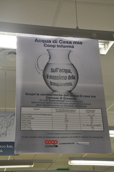 Da oggi, lunedì 8 luglio, nel reparto “Acque” di tutti i punti vendita Coop di Grosseto, i clienti troveranno una scheda informativa con le caratteristiche chimiche e micro-biologiche dell’acqua del rubinetto di casa, in modo da effettuare una scelta ancora più consapevole. Sono 9 i parametri pubblicati nella tabella informativa consultabile nel supermercato: concentrazione ioni idrogeno, cloruri, ammonio, nitrati, nitriti, residuo secco a 180°, durezza, fluoruri e sodio. Per ciascuno vengono presentati i limiti previsti dalla legge ed il valore analizzato a livello locale. I parametri, costantemente monitorati dagli enti preposti, sono stati aggiornati da Acquedotto del Fiora, gestore del servizio idrico integrato nei territori di Grosseto e Siena, che ha aderito all’iniziativa.