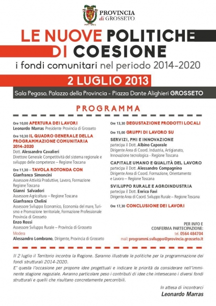 Grosseto: “Le nuove politiche di coesione. I fondi comunitari nel periodo 2014-2020” è questo il titolo dell’incontro che si svolgerà martedì 2 luglio nel Palazzo Aldobrandeschi dalle 10 alle 17:30. La Provincia di Grosseto e la Regione Toscana illustrano le politiche per la programmazione dei fondi strutturali 2014-2020.  Gli attori economici del territorio sono invitati a partecipare per proporre idee progettuali e indicare le priorità da considerare nell’imminente stagione negoziale. Avranno particolare peso i contributi che intersecano i diversi fondi strutturali e le proposte che risultano concretamente percorribili. L’obiettivo infatti è quello di usare in modo più efficiente possibile le risorse comunitarie.