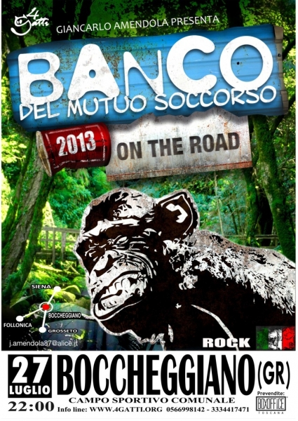 Grosseto: il 27 luglio 2013 la band-leggenda del rock italiano Banco del Mutuo Soccorso farà tappa a Boccheggiano (a poche decine di km da Follonica/Grosseto/Siena/Piombino) al concertone dei 4 Gatti con il Tour On the road 2013. Il concerto rievoca i principali momenti della gloriosa carriera del gruppo capitanato da Francesco Di Giacomo e Vittorio Nocenzi, per un tour-evento che si preannuncia tra i più importanti dell'anno.